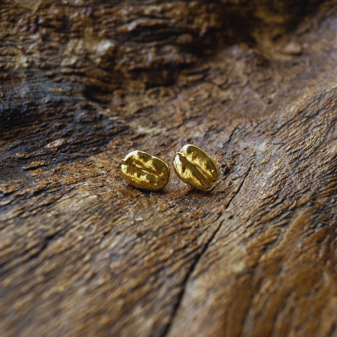 Brinco feito com o grão de café banhado a ouro 18k através de um processo de produção artesanal e sustentável.