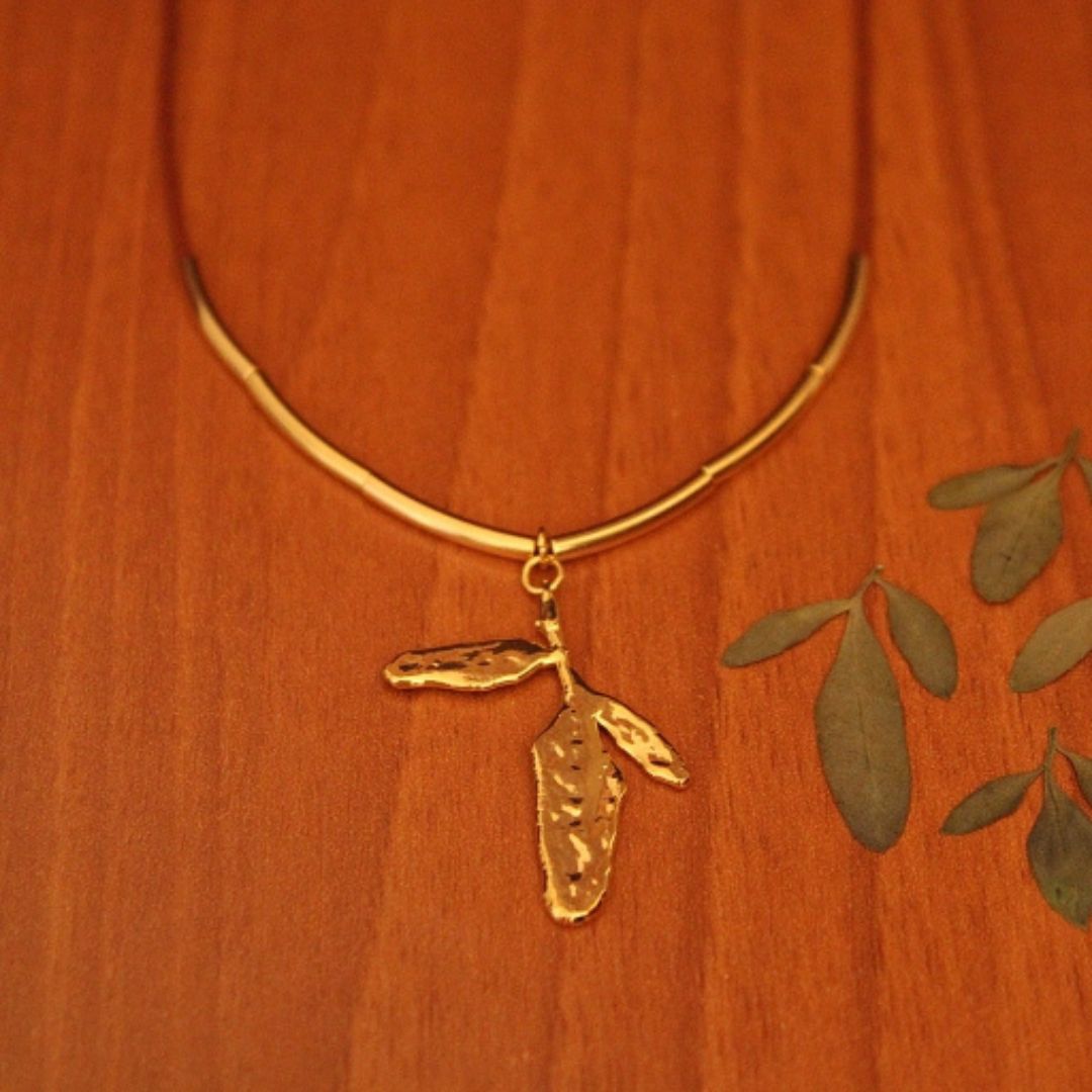 Colar feito com a folha de arruda banhada a ouro 18k através de um processo de produção artesanal e sustentável.
