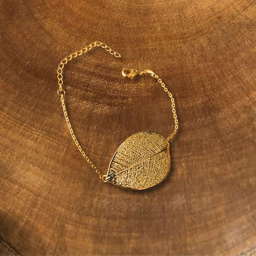 Pulseira feita com a folha Minurinha Bicuda banhada a ouro 18k através de um processo de produção artesanal e sustentável.
